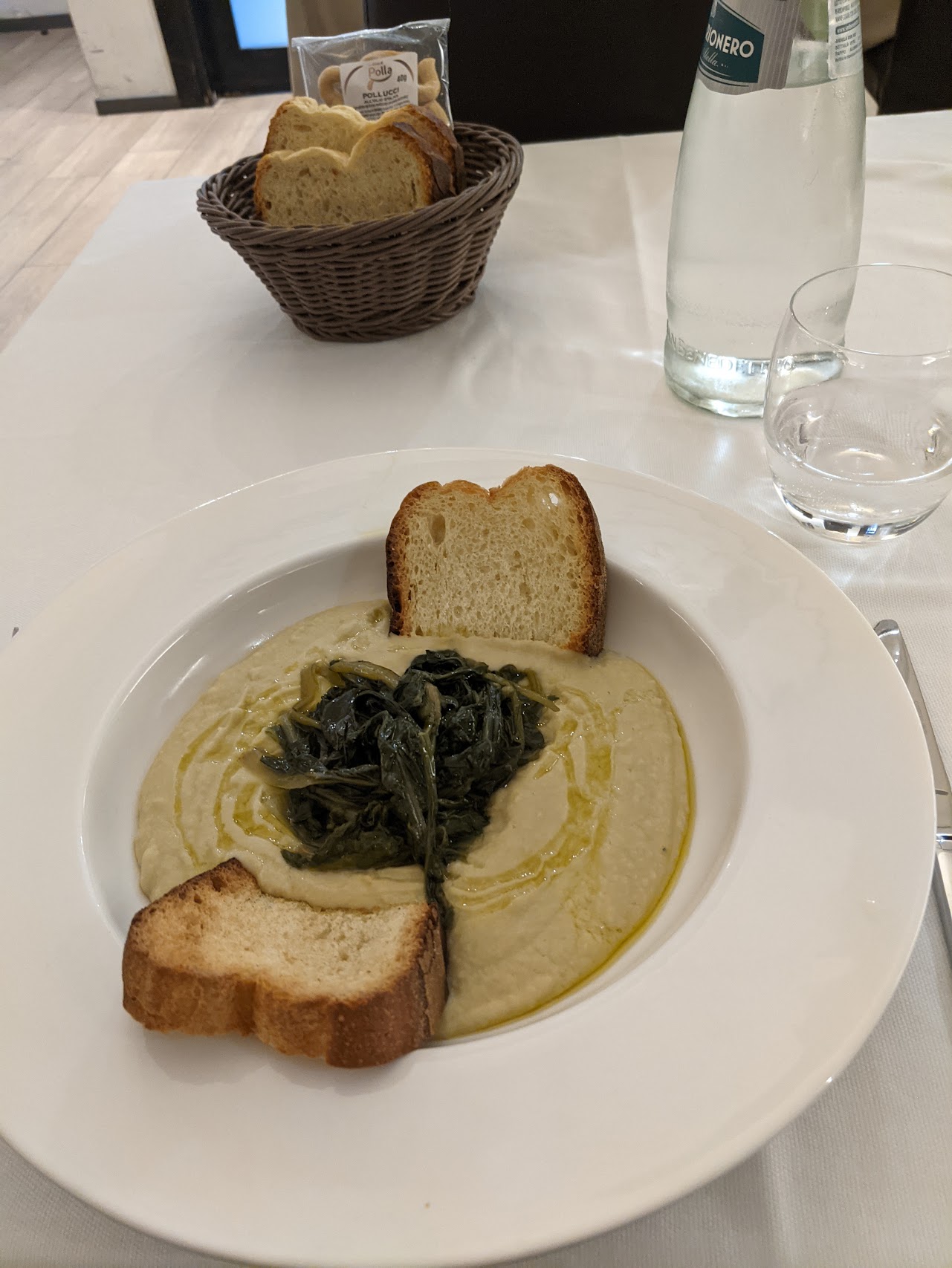 Taralli and the smaller tarallini are ring-shaped crackers with a grainy texture like sand that are perfect for aperitivi. Frisellini are extremely dry rusk-like bits of bread that, when you cover with oil and tomatoes, are surprisingly edible. Then there is toast, which is here accompanying pureed beans and bitter chicory covered in olive oil, which is delicious.