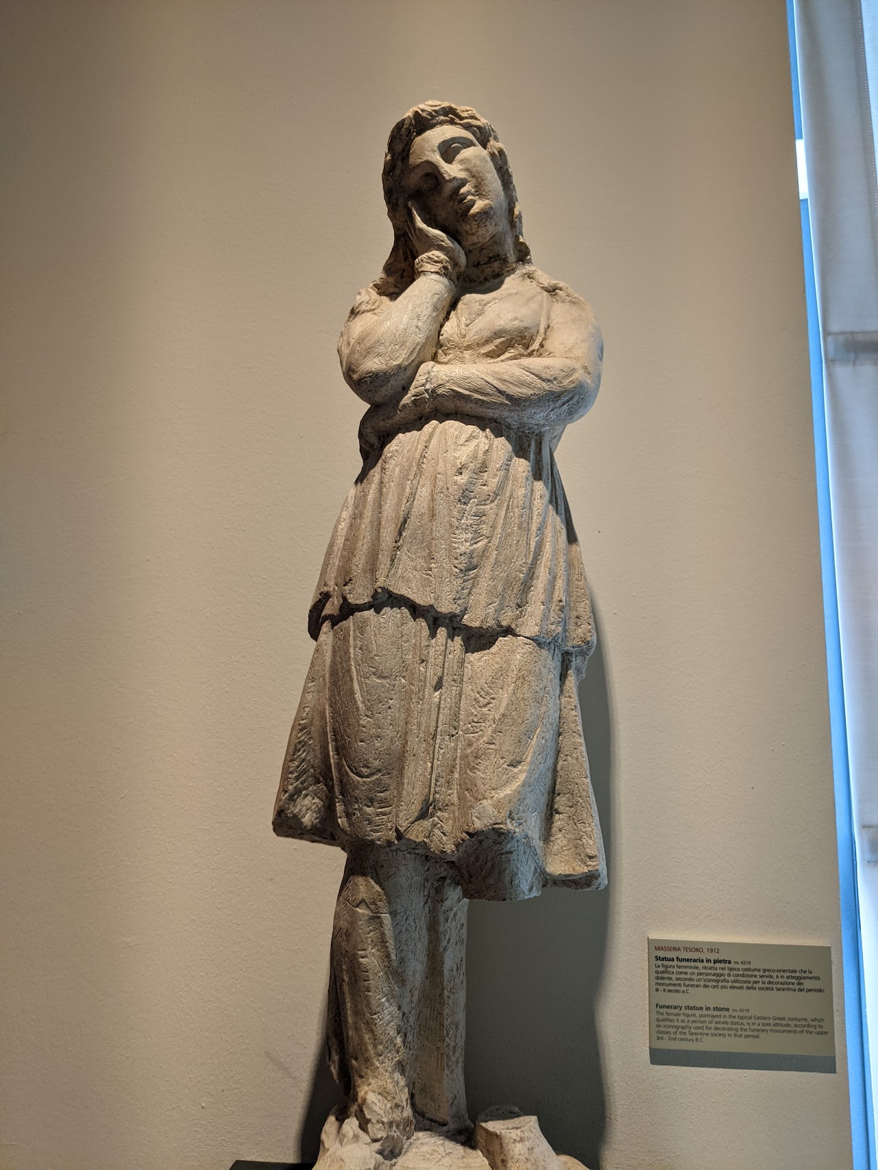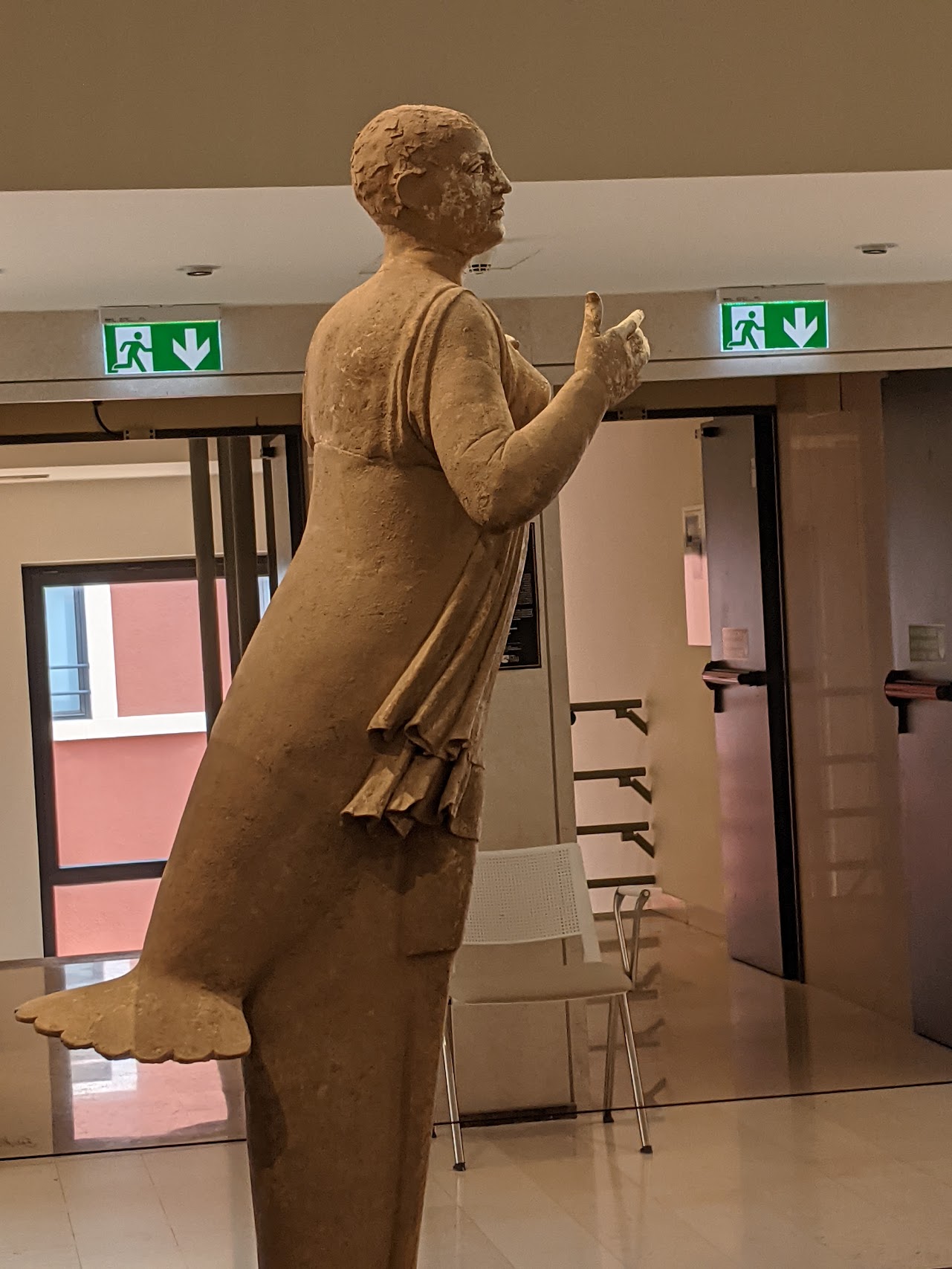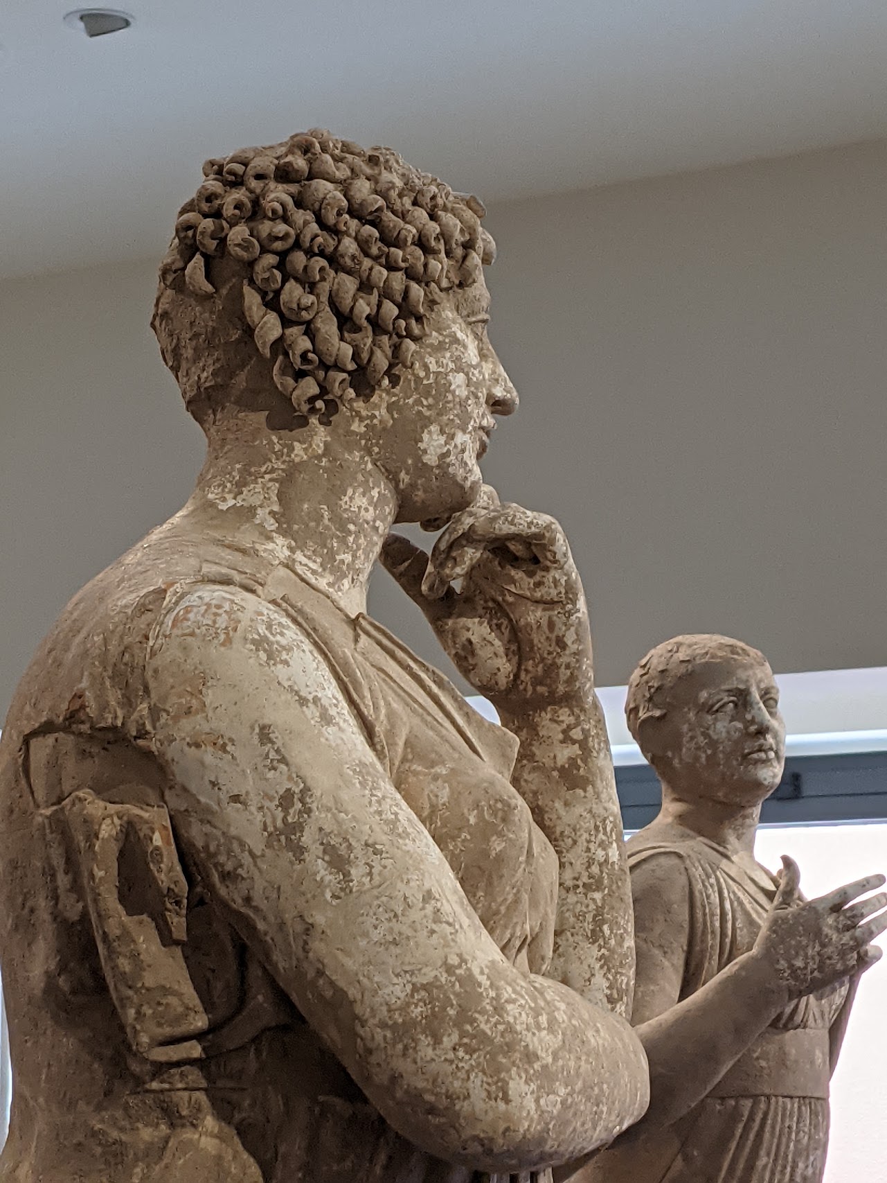 It was a group of three almost life-sized figures: Orpheus seated and playing a (missing) instrument, and two Sirens facing him. One Siren is singing, the other holding her chin in a pose that the caption said is a common attitude of distress. Two of the figures were missing their hair, on the Siren that still had hers you could see that each curl was fashioned separately. The group of statues, discovered in the 1970s, had been illegally trafficked to the USA but has been back in Italy since 2021.