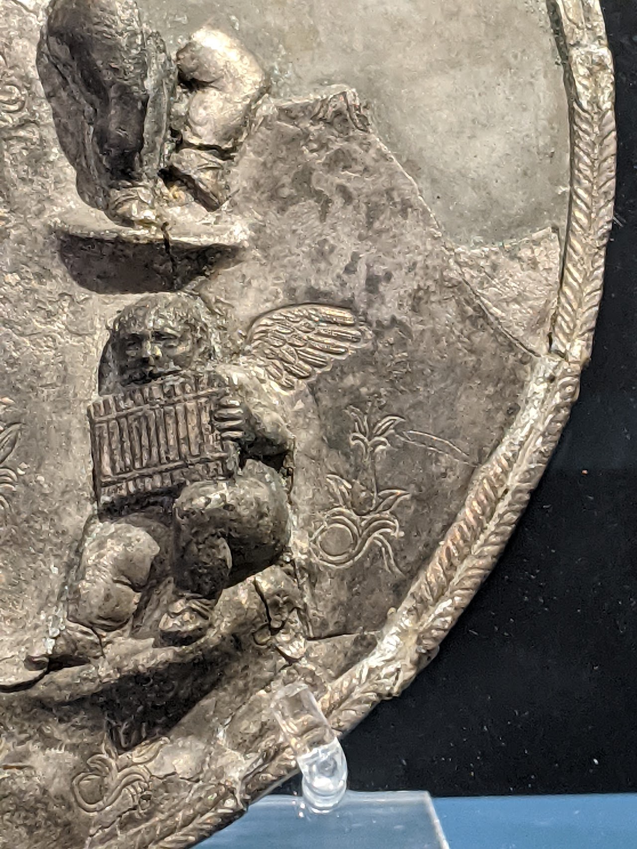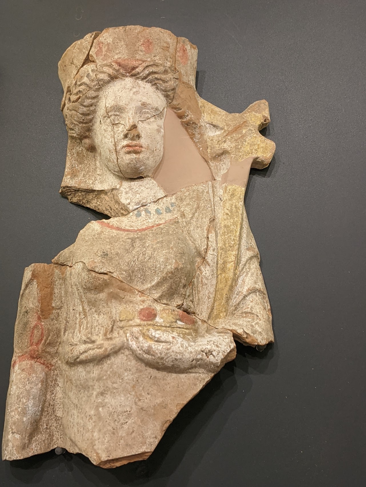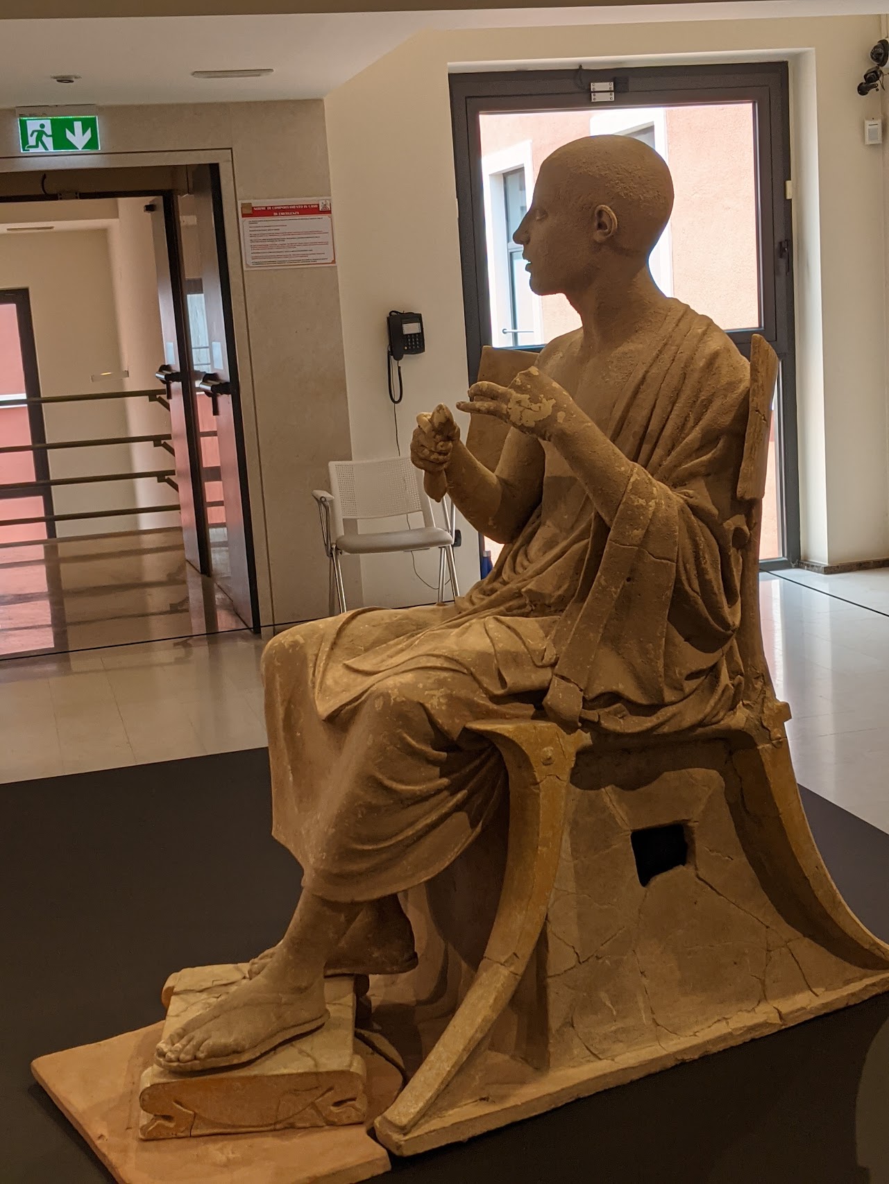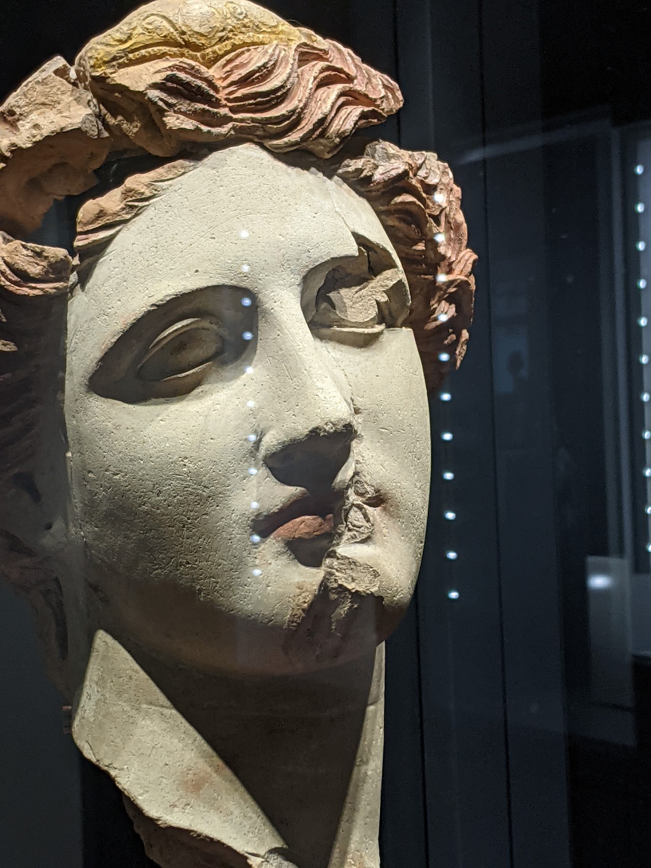 It was a group of three almost life-sized figures: Orpheus seated and playing a (missing) instrument, and two Sirens facing him. One Siren is singing, the other holding her chin in a pose that the caption said is a common attitude of distress. Two of the figures were missing their hair, on the Siren that still had hers you could see that each curl was fashioned separately. The group of statues, discovered in the 1970s, had been illegally trafficked to the USA but has been back in Italy since 2021.