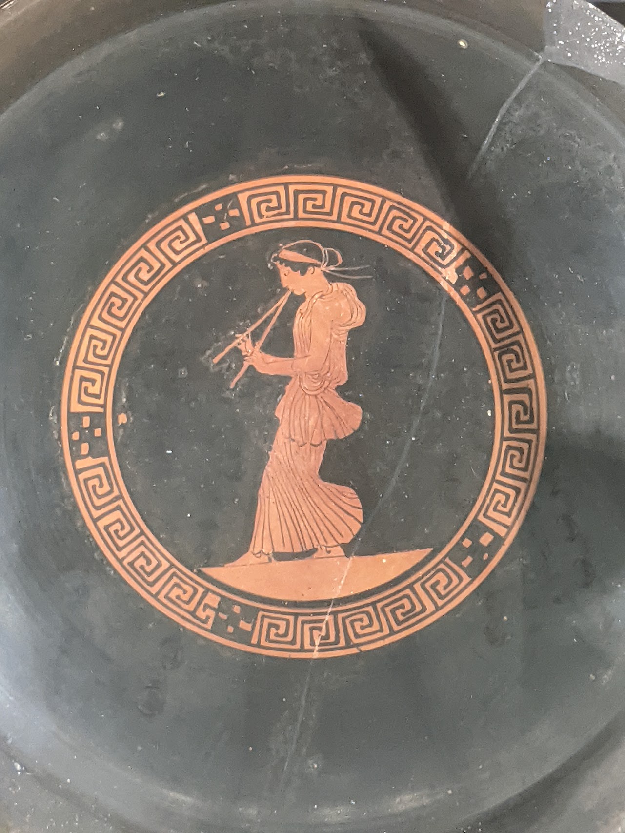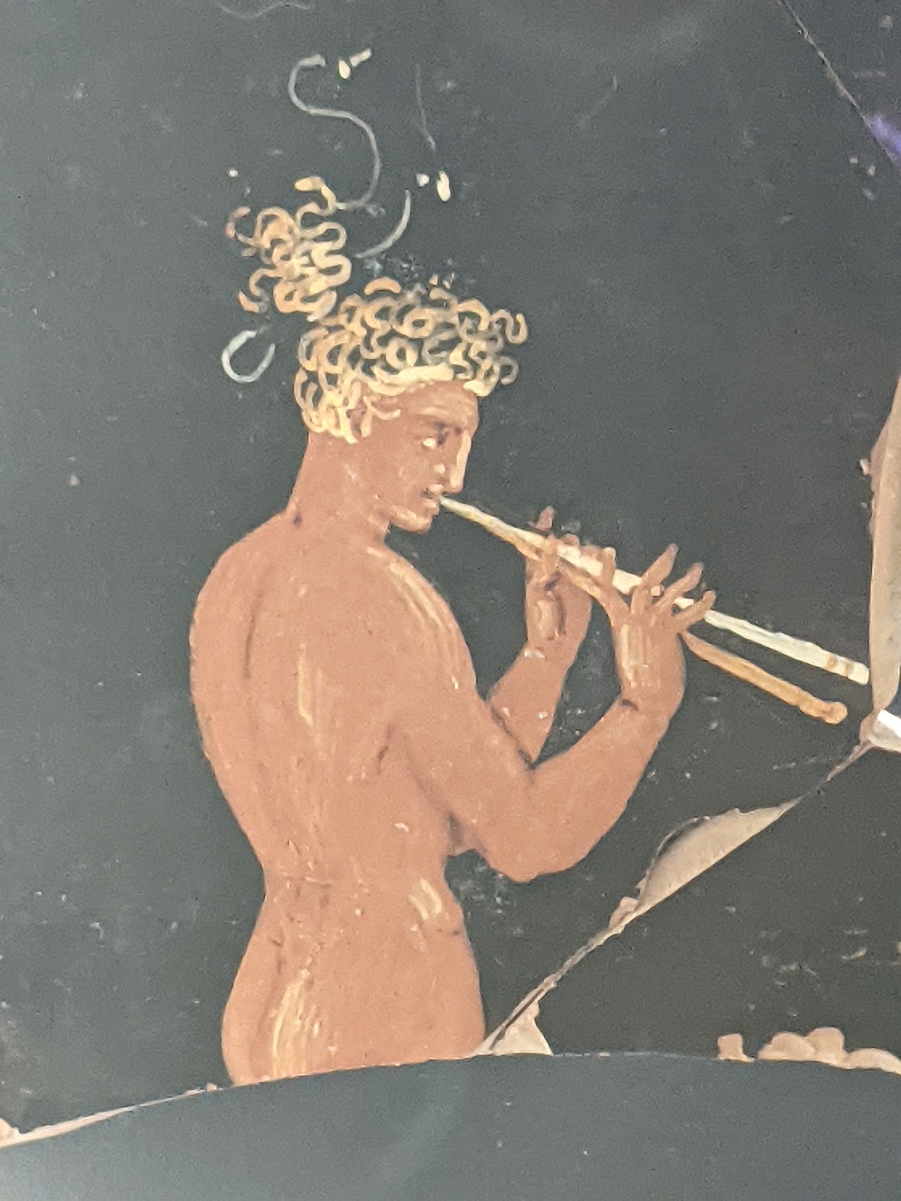 There are reminders of how important music was to the Greeks throughout the museum. Several vases feature depictions of ‘auletes,’ people who played the double flute. It even appears on a vase that was awarded to the winner of the pentathlon at the Panatheniac Olympic Games, the man buried with other rich treasures in the so-called ‘Tomb of the Athlete’. Recently, musical archeologists have reconstructed the aulos and you can even listen to how it may have sounded here and here. I also a detail of a winged satyr playing something like a panpipe.