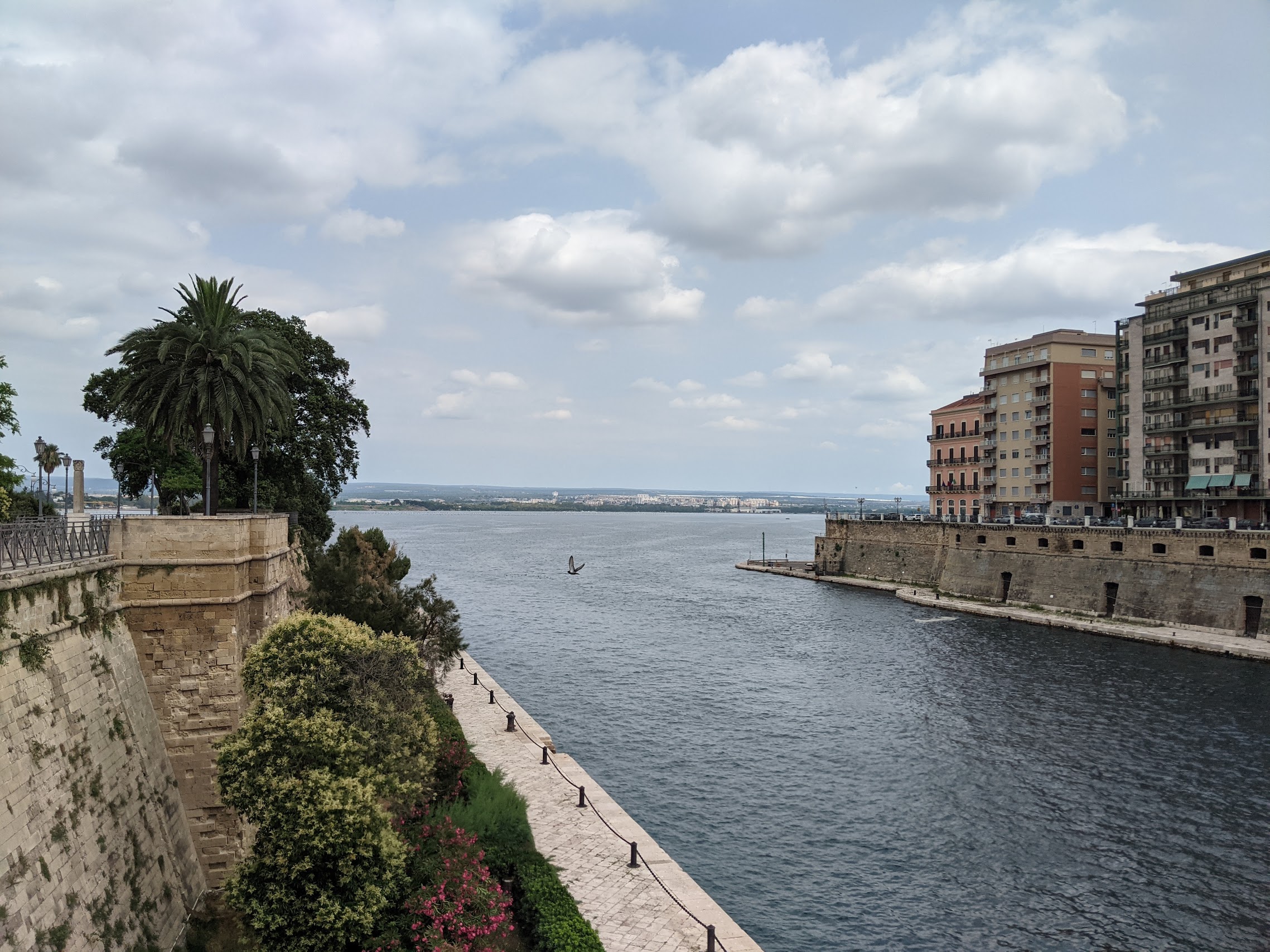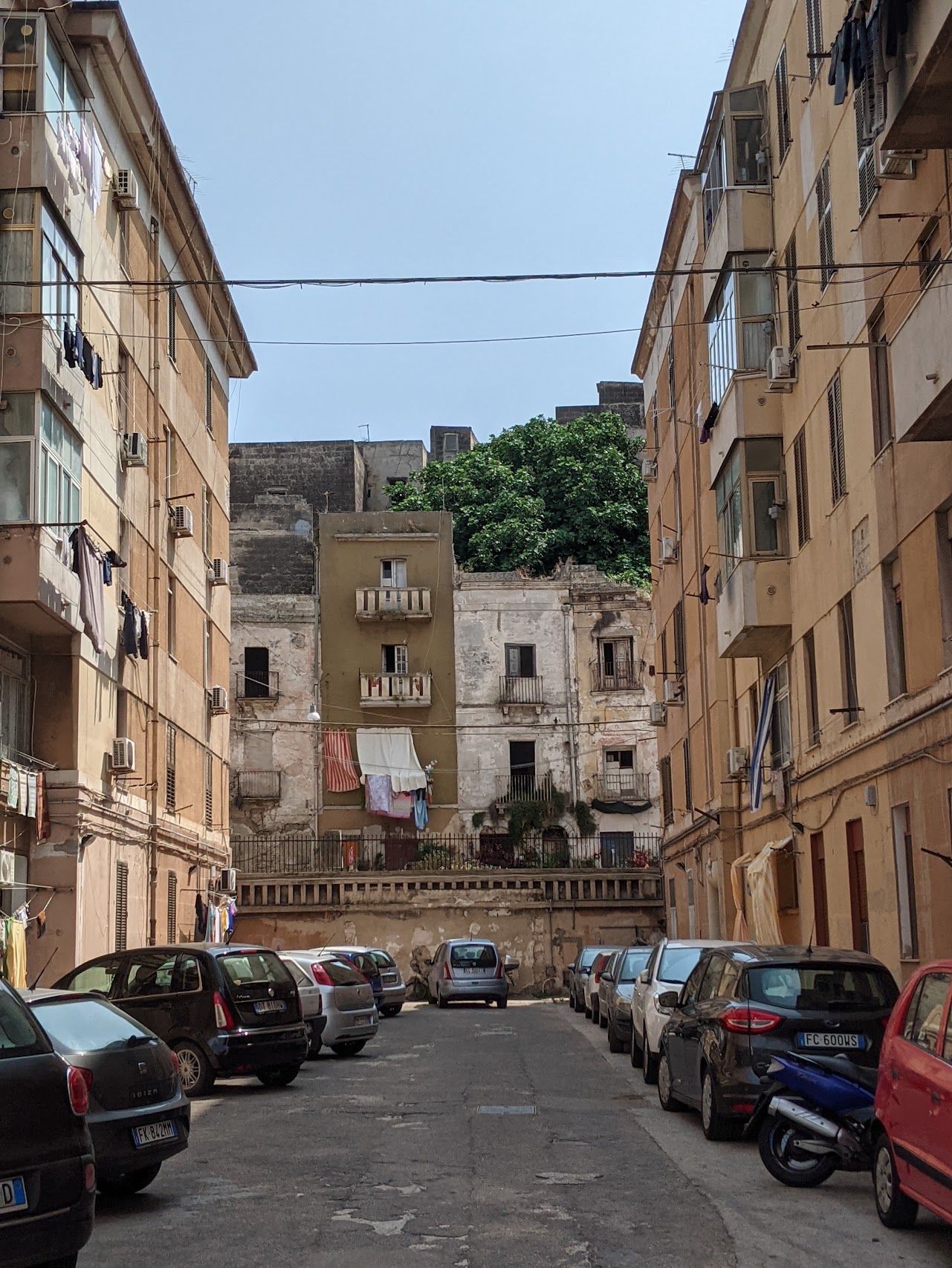 We’d parked on the tiny island that was historically the heart of the city and has a castle to prove it. As such, we faced a walk uphill in shocking heat (the Mediterranean is burning up thanks to climate change). We hugged what little shade there was and trudged, sweating, past an anarchist library, skeezy bars, tenements and a fish market up to the bridge that connects to the mainland, walking over a navigable canal that connects the Mar Piccolo to the Ionian Sea.