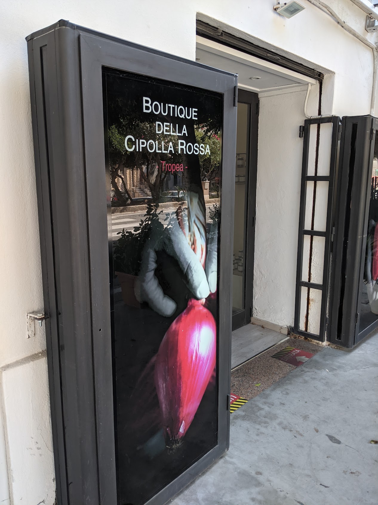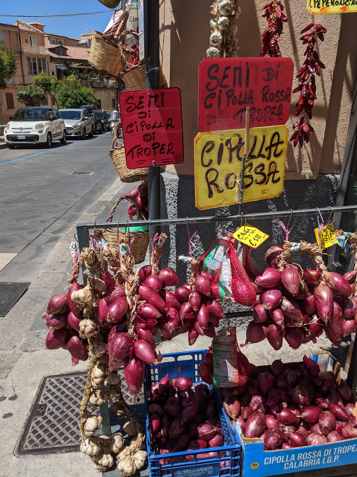 Another star is the local variety of red onion, famous Italy-wide for its fresh sweetness. In markets throughout the peninsula, you will see bunches or braids of these pink, slim, elongated onions with the ‘Tropea DOP’ label. They can be eaten raw, put in a frittata, stuffed, added to salad or made into jam (or, as John suggests, thrown). According to a few signs about town, they can also be put into gelato.